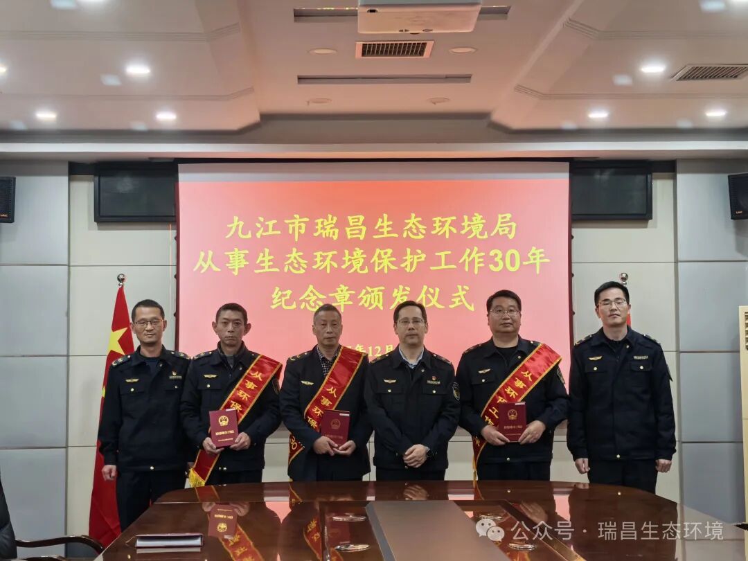 “从事生态环境工作三十年纪念章”既是褒扬、也是鞭策,既是激励、也是传承。自2016年生态环境部设立“从事生态环境工作三十年纪念章”以来,瑞昌生态环境局已有16人获得表彰。瑞昌生态环保人将坚守初心,接续奋斗,为了瑞昌的天更蓝、水更清、山更绿、环境更优美而不懈奋斗!
