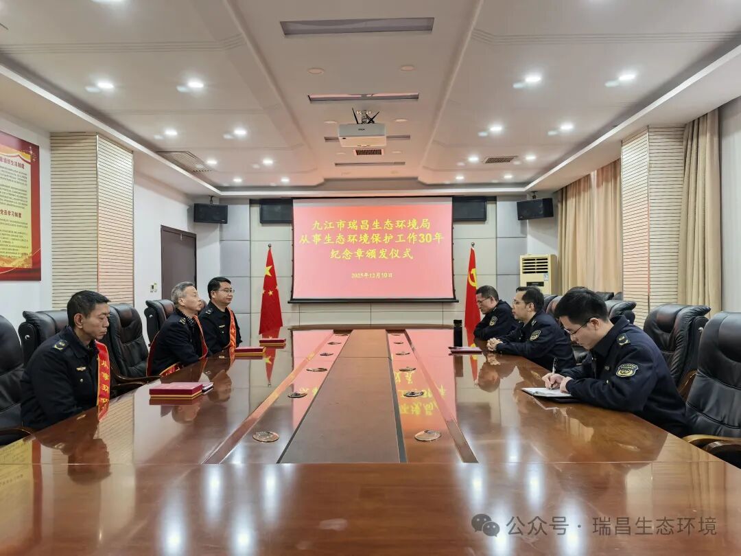 12月10日下午,瑞昌生态环境局举行“从事生态环境工作三十年纪念章”颁发仪式。局党组书记、局长易波出席颁发仪式并主持座谈会。
