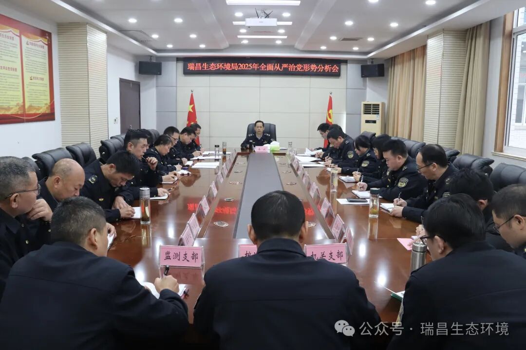 12月24日上午,瑞昌生态环境局党组召开2025年全面从严治党形势分析会,深入学习贯彻习近平总书记关于全面从严治党重要论述,总结全年工作情况,分析研判当前形势,部署安排下步工作。局党组书记、局长易波主持并讲话。局领导班子成员,局机关各股室、局属各单位负责同志,各党支部书记参加会议。