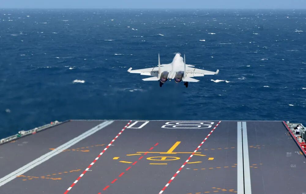 海军福建舰开展入列后首次海上实兵训练期间,歼-15DT舰载机弹射起飞(资料照片)。新华社发(高泽明 摄)